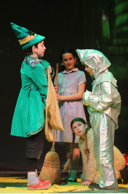 The show starts in a dull-ish farm in Kansas with Dorothy (Clara Brueggemann) being threatened by having her precious dog Toto (Frankie Gullick) taken away by Miss Gulch (Evie Millward). Dorothy sings Somewhere over the Rainbow with a heartfelt and exquisite singing voice. She then consults with a fortune teller (Cooper James) that her beloved Aunt Em (Ellie Law) may be sick. She rushes home getting caught in a tornado that whisks her off to the magical Land of Oz inside her house with special effects being projected onto a backdrop. She finds herself in Oz where she meets Glinda, Good Witch of the South (played sincerely by Rosie Preedy). She is praised by Munchkins and who dance and sing Ding Dong the Witch is Dead in a chippy-chirpy tone. In Munchkin land, the scenery is of large colourful flowers, which works well. They are beautifully made and fit the atmosphere of Munchkin land, although in other scenes (like the Wicked Witch of the West’s castle and the Emerald City) the bright flowers seem quite of out of place.