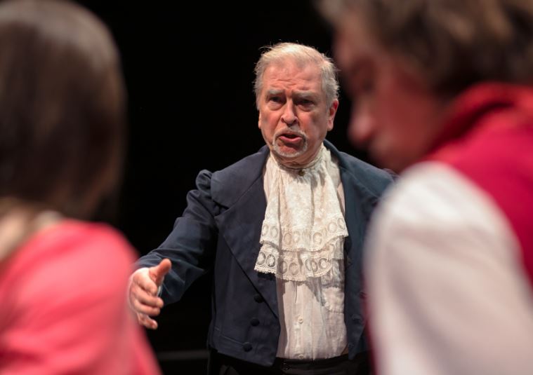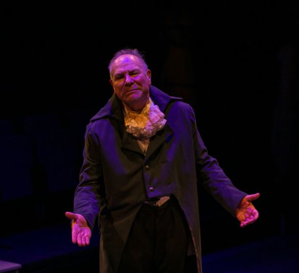For this production, the studio is configured thrust style, with seating on the two long sides and either side of the entrance. This works well as the production has opted for an “always on” – well, nearly – style of delivery, so what would be the cyclorama is taken up with storage for costume elements and props, plus some seating for members of the cast who are not in the scene being played, above which is a large mock-up of a classical picture or mirror frame. Within this frame, the audience is presented with projections of ‘humorous engravings’ of Theodore Lane, an artist and engraver championed by Peirce Egan, but who died tragically young, plus titles of, and introductions to, scenes, provided in a period font. All of which sets the tone for a proper pacy production. I liked that. The proceedings are also blessed with Musical Director-Keyboard player Graham Reid, with the keyboard set appropriately to a harpsichord-style effect. The music featured is that of the late-Georgian era composer, actor, and singer Charles Dibdin. I tip my hat to the attention to detail in all these respects. For me, it gives a real boost to authenticity.