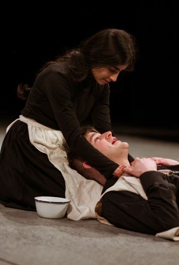 The ensemble, mostly dressed in black, are well drilled and fluid with their entrances and exits. Particularly sensitive performances by the “young lovers” played by Adam Keenan (Arthur Clennam) and Sweta Gupta (Little Dorrit). Adil Akram (William Dorrit) bought a feeling of poignancy to his impoverished state, transforming into wide-eyed joy in his affluent elevation, while Omar Aga (Mr Merdle) was “in your face”, robust and forthright. Carol Fullilove (Mrs Clennam) played a firm and authoritative mother figure and a couple of enjoyable cameo roles came from David Erdos (Mr Meagles) and Simon Taylor (Doyce) as the enthusiastic and eccentric inventor.