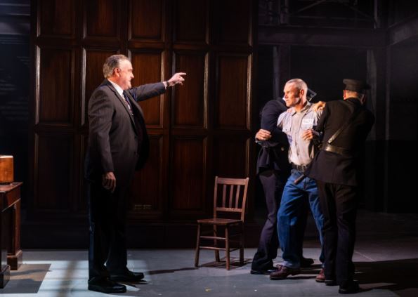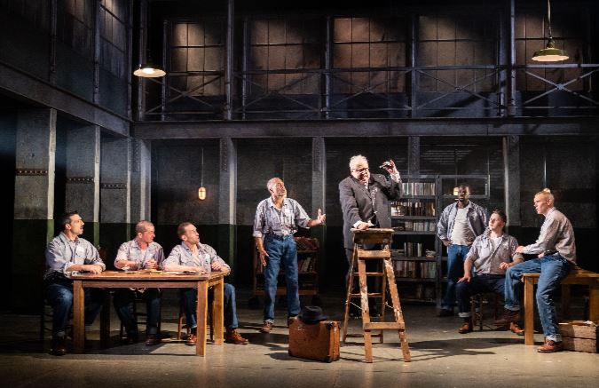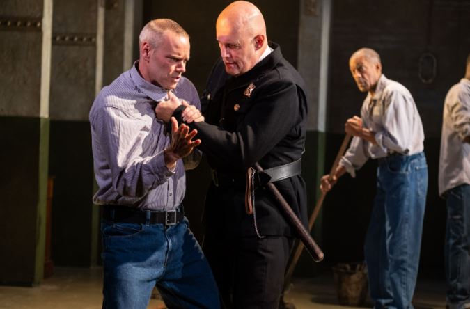 The grimness of designer Gary McCann’s foreboding set underlines the predicament of the prisoners. It is all grey concrete stanchions and peeling hard walls, regularly punctuated by caged bulkhead lights. Armed guards patrol the surrounding galleries and landings. This is the Shawshank State Penitentiary, somewhere in the US state of Maine. The threatening atmosphere is accentuated by Chris Davey’s lighting, while Andy Graham’s soundscape of menace opens as the play goes up. The ear-shattering sound of heavy chains, bolts and shackles makes an incontestable point.