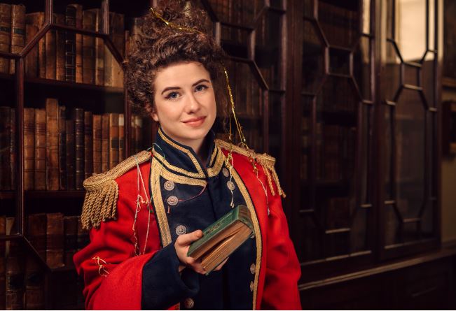 A clean, simple set design conveys grand houses and a literature backdrop (books are in evidence everywhere). Coupled with the mostly one-piece costumes to enable quick changes, this allows the actors freedom to fully exploit the space (stairs, cupboards and the auditorium) and their characterisations. Five female servants – who are often ignored in such stories, but critical to the plot (“who can have a liaison without clean sheets”) re-tell the Darcy – Elizabeth Bennett romance – playing all the key characters – complete with rapid costume changes and perfectly timed entrances worthy of a classic farce. They take us through the fripperies, faux pas and fancies of the tale with a few ‘Eff Orf’s thrown in. A particularly lovely touch is that the servants retain their own accents within the characterisations of the novel, so we are treated to a broad Welsh Lizzie Bennett (a hilarious Emmy Stonelake) and a Mrs Bennett (Dannie Harris) channelling Catherine Tate’s Nan!
