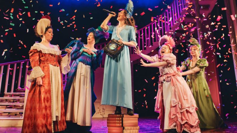 There is quite a bit of plot to convey, as the play retains all the key episodes of the original novel. So occasionally a scene will be predominantly verbal story telling rather than dramatic or comedic action, but the pace rarely lets up and the crisp, clear writing ensures the plot and characterisations are clear without the need for excessive dialogue. The use of a range of pop songs to both punctuate the action (Carly Simon’s You’re So Vain as Elizabeth’s commentary on first meeting Darcy) and add emotion to a character’s plight allows the audience to draw breath without losing the energy.