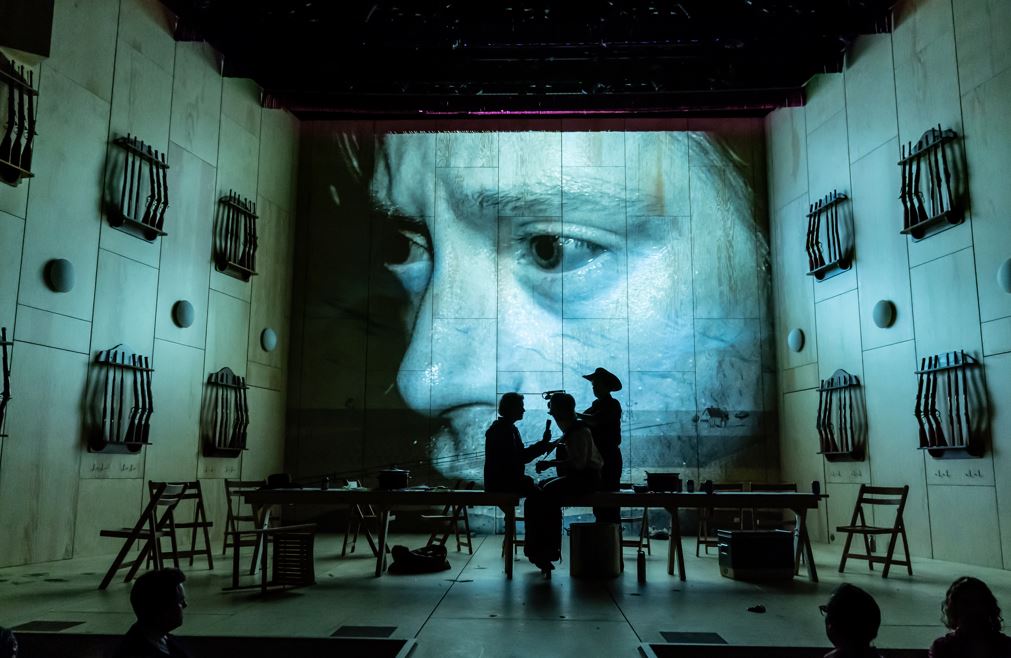 Prior to Jud’s outpourings in this song, he has been visited in his smokehouse by Curley, in particularly vicious mood, who encourages Jud to commit suicide, with the cruel song, Pore Jud Is Daid. The presentation of this scene is a remarkable coup de theatre for lighting designer Scott Zielinski. His lighting plot makes the stark distinction between positive scenes, lit so brilliantly that light spills into the auditorium, and negative ones, in semi-darkness or in a total blackout. The scene starts in the complete darkness, then by a hand-held night vision video-camera, the two actors’ faces being projected a full close-up on the cyclorama backdrop. The reactions are shown in forensic detail, Jud’s quivering lips and then the fall of a tear … stupendous acting and consummate technical artistry.