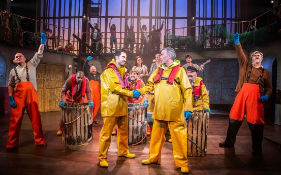 Jason Langley makes a suitably light-footed and quick-talking Danny, giving him an edge that trims back his self-awareness enough to believe in his own confident optimism. There is a sense of wide-eyed wonder at this new environment where, in a Cornish fishing village, he is, well … er, a fish out of water. The community’s wariness of Danny extends to undisguised hostility at first. Danny remains unfazed, seeing here an opportunity, against the odds, to commercialise the fishermen’s sea shanties and pub songs, and a way back into his lost career in the recording industry.