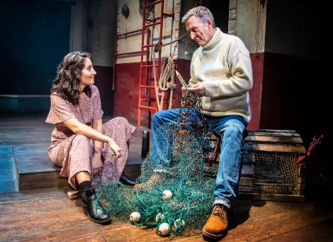 Designer Lucy Osborne’s set is as robust as the concept, a compact semi-circle, which acts as the sea wall, as cottages and guest-house, and much more, including by means of a simple pair of double doors, The Golden Lion, the local pub and focus of all that happens in this corner of Port Isaac. The design’s triumph is the fishing boat, out at sea, as exhilarating and impressive a start as you could wish for. It is buffeted by the storm by means of ropes and rockers, half hidden in haze and enhanced by Joanna Town’s inventive lighting and the busy atmospheric soundscape of Dan Samson, who doesn’t stint the decibels when it comes to an Atlantic storm.