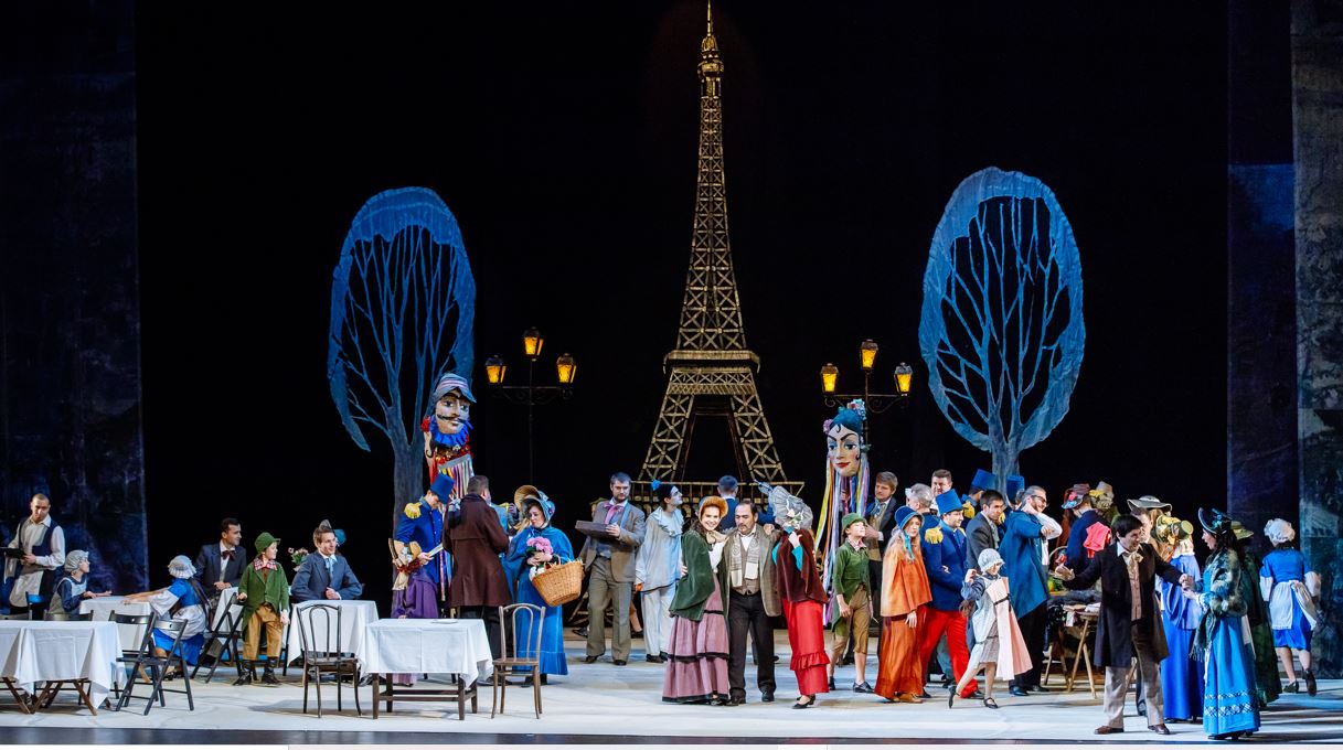 Staged simply but effectively against a painted backdrop of the Paris skyline, this is clearly a production which has been designed for touring, but the set across all four acts is richly detailed and vibrant.  Familiar arias are sung with ferocious energy, as though being performed for the very first time.