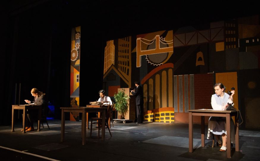 With a bold painted set, designed by Tom Wright and Priya Virdee, of cogs and doors that symbolised turmoil, the production opened up to a New York office where the staff, like a Greek chorus, talked in a refrain as they bullied the secretary for being late.