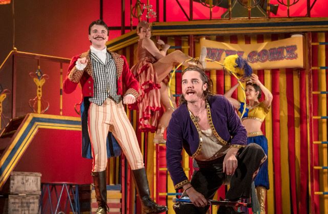 A circus big-top creates both the setting and the ambiance of the show. Designer Sara Perks’ multi-level fairground circus set allows three-dimensional movement. Its colours are of the Senyera, the yellow and red Catalan flag, and this vibrancy of colour follows through into the costumes. They are bold exaggerations of Victorian attire, except for Nellie Bly, whose costume replicates in black and white the travel suit and cap that Bly wore throughout the whole of the journey. The construction of the costumes is a work of art by Hazel Jupp’s wardrobe team at York Theatre Royal, as these had to allow for highly athletic movement, and quick-changes requiring much under-dressing.
