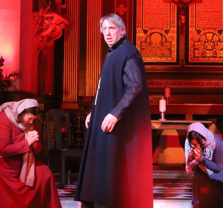 St. Mary’s Church in Twickenham provided a historical and eerily fitting backdrop for the performance. With much of the grandeur of a cathedral despite its stature as a diminutive architectural sibling, the church’s rich history dates back to medieval times, with its 15th century battlemented tower still standing today. This created an atmosphere that felt seemingly contemporary of Becket and Henry II (even with an interval where modernity returned with the checking of smartphones), the church’s décor and interior standing as a mirror of the central conflict of the play.