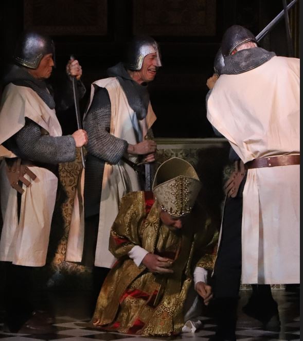 After the ear-piercing shriek at its origin, the play delves into an equally uncomfortable power struggle between the secular and the spiritual, revolving around the political tensions between Becket and King Henry II. As Becket returns from exile in France, he knows he is walking into danger, but is determined to continue his duties as Archbishop, facing a series of temptations and confrontations by four visitors, as he chooses to defend the Church’s autonomy against the king’s perceived encroachment.