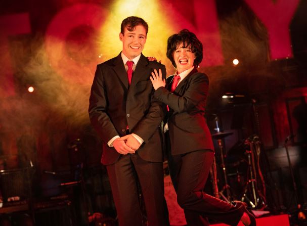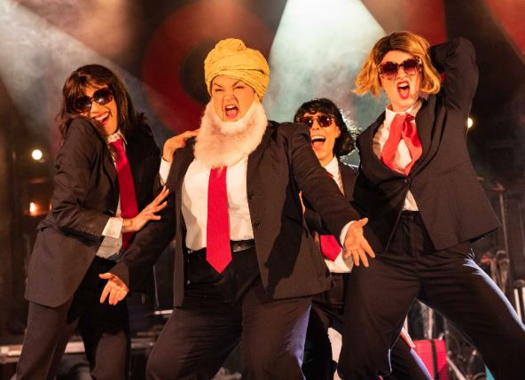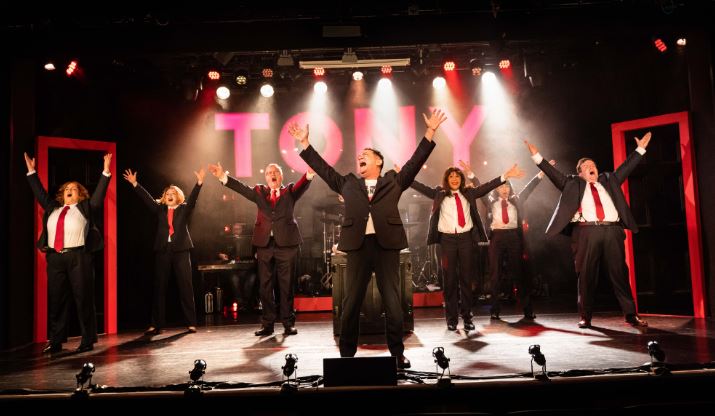 Hence Tony! The Tony Blair Rock Opera is all packaged neatly as a musical.  Musical director Tara Litvack leads the band, Ben Uden’s guitars and Harry Bent’s drums, from the keyboard, tirelessly whirling through Brown’s adroit but eclectic score, referencing everything from heavy metal to Sondheim.  And, hold on, was there a brief homage to Handel, here praising the messianic Blair!