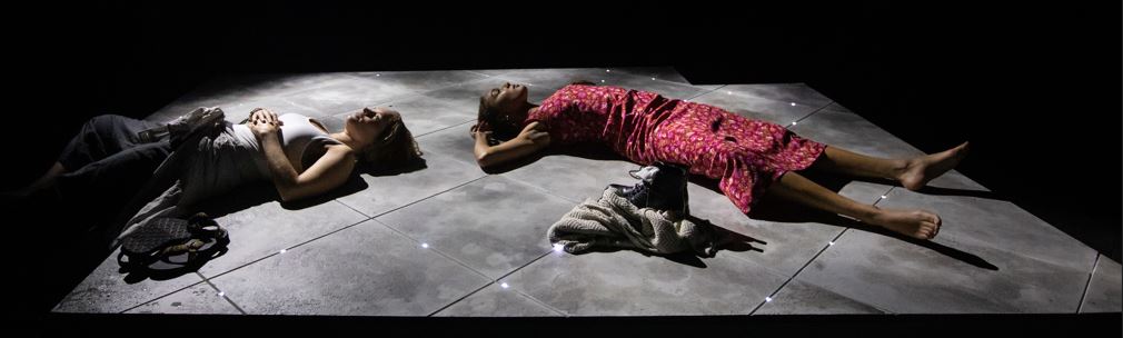 Amy Jane Cook’s minimalist setting in the round with a raised platform and moveable tiles provided an uncluttered space for six actors to play the three characters as younger and older women, those offstage but stationed at corners of the auditorium providing soothing musical sound (Nicola T Chang & Sinéad Rodger) which enhanced the onstage performance and moved the action along in a rather ethereal way.