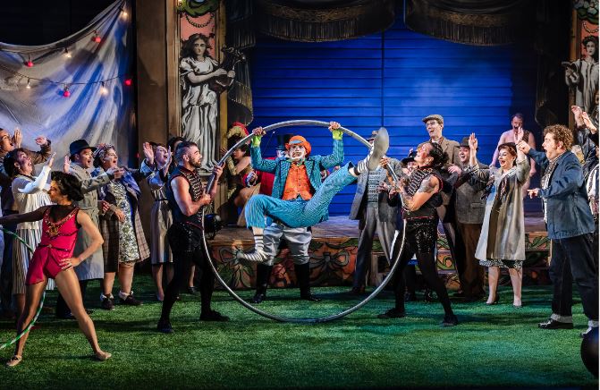 Apart from singing and dancing, the chorus are also involved in scene shifting in an equally well choreographed movement that transforms the village hall to the to the village pub, as the set slickly and seamlessly elides between the first two acts. Designer Kevin Knight has created three separate yet complementary period-perfect sets for each of the acts, all of which are authentic, well-observed and witty in their meticulous detail. So the village hall with its side kitchen transforms to the convivial hive of social activity that is the village pub. In the second half the action moves outdoors to the village green dominated by the circus with its fairground proscenium-arch stage, a real working circus. Lighting designer Howard Hudson skilfully incorporates the natural light that floods the Garsington stage through the theatre’s glass walls, with stage lighting that gives a balanced authenticity to each scene.