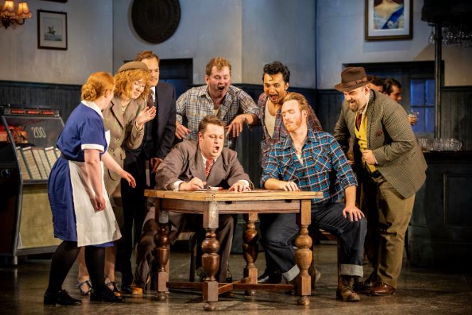 The most memorable contribution from the chorus must be the creation of a subtly faceted human background. This is not an homogenous crowd, but a coherent group of individual interesting characters. Each chorus member acts out their own person with their own backstory. There’s the district nurse, the pungent pig-farmer, the pregnant mum besotted with her own baby-to-be, the postmistress, the pair of lairy Teds. They chat, they flirt, they squabble, they joke. There’s dominoes, darts and dalliances. The boys quaff light-n-bitter, the gals sip Babycham. These are real people with a living community spirit. One would need to see the opera several times to take in this Bruegel-esque atmosphere. Nevertheless, the acting is toned-down just enough to avoid pulling the focus from the main action, although occasionally being perilously close to doing so. However it certainly does not swamp the principal roles and the main action.