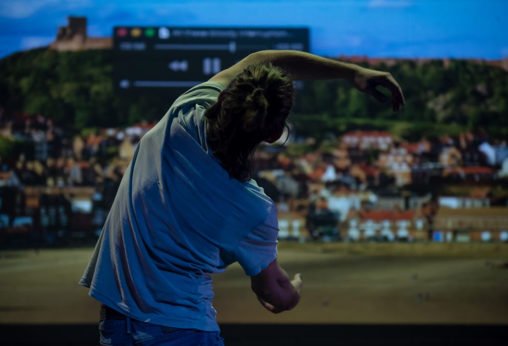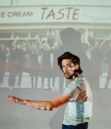 With Arsenal fans en masse downstairs, we embrace the calmness of a small theatre. Described as a one-man dance and spoken word performer, Lewys Holt moves supplely against a minimal slideshow. Tormenting slogans appear above him: ‘Did I leave the oven on?’ … that well-known paranoiac situation and its desperate logic worked well. After a witty story, the old chestnut, ‘An apple a day keeps the doctor away’ is reflected upon, before becoming an interactive discussion that brought hilarious results. Then Holt excels with some captivating dance movements.