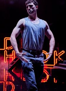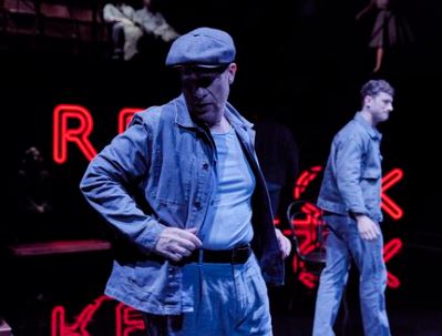 There is a fine shiny black set from Moi Tran, with the place name Red Hook – home to many migrant Italian dockworkers – in red neon at the back of the stage. There is a hint of deep waters with something nasty lurking underneath the infinity pool. Rodolfo (Luke Newberry) suggests an alternative version of masculinity to Eddie’s that is willing to indulge in pleasure, admit to an interest in music, and have potential for empathy. This means that Eddie suspects that he is not a ‘real’ man, and only interested in Catherine (Rachelle Diedericks; somewhat bland in a bland role) in order to get a green card. Elijah Holloway, in his professional debut, plays one of the stevedores, but also appears from time to time in ballet gear, both showing off his substantial muscles and dancing on his toes like a ballerina, presumably a symbol of the ambivalence and wokeness that Eddie dreads.