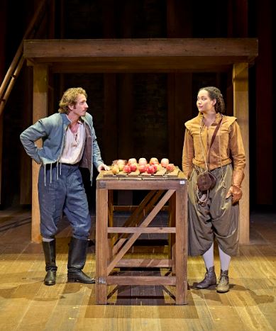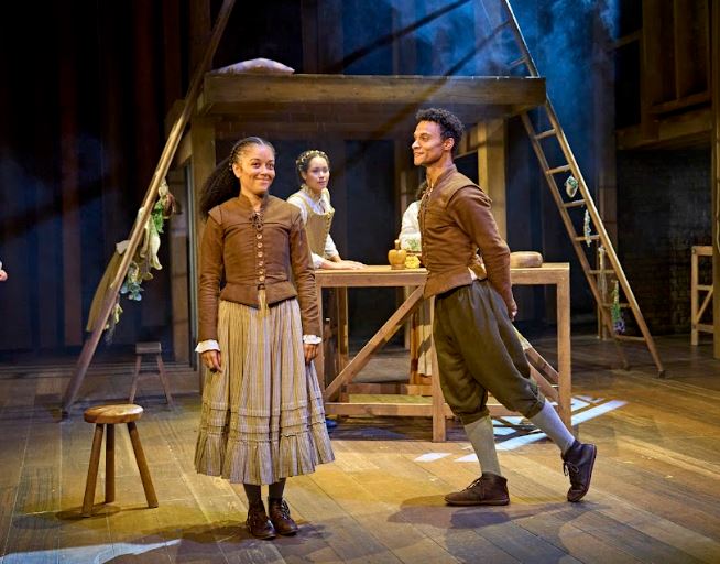 The illiterate Agnes’ talents are very different from the academic skills of young Latin tutor Will, although she is savvy enough to point out that the roof area under the attic is hers, as it forms the letter A. And this is the preeminent feature of Tom Piper’s ingenuously simple robust set, which appears to be made of massive oak beams. (Hamnet’s London run has already been extended and it could be around for some while.) It provides the loft that is the bedroom for the youngsters of the house. Fly height ladders can be adjusted by pulleys and trucked platforms convert it to various rooms and even to the stage of the Wooden O at the Globe. At the pre-set, a fruit storage rack presents still-life with apples, but this is where Will woos Agnes and where they first make love. And when the mood is different, a fireplace appears on the stage, the practical fire-pit that is a feature of RSC’s Stratford home. All is richly lit by Prema Mehta.
