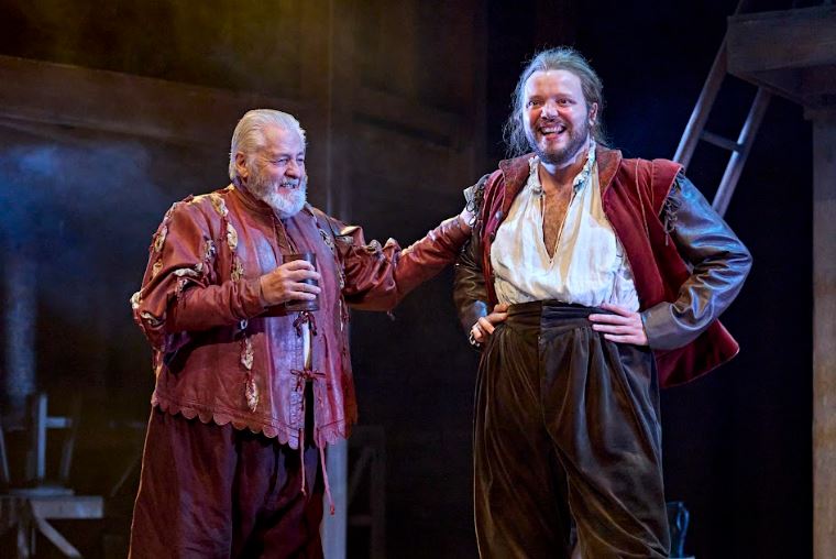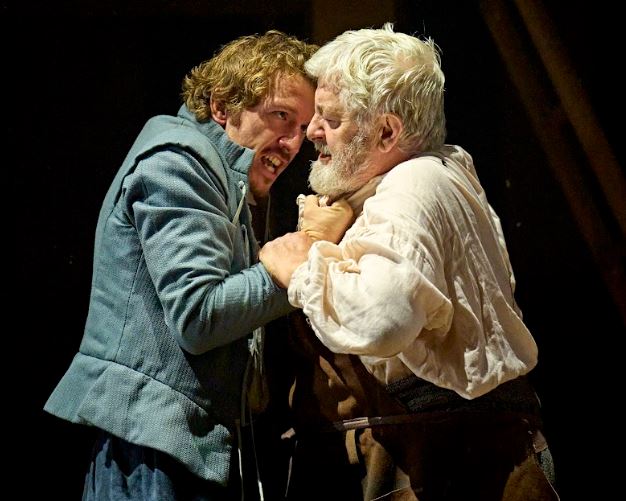 In Hamnet, however, John is presented as a drunkard, verbally abusive to all, and physically aggrieve to his son, Will. He is however, a complex character. His emotions are as much internalised as Agnes’ are externalised. It is a great role for a great actor and Peter Wight gives a powerful performance of John’s own seeming inadequacies, as it seems to him, against the successes of his own family, and especially against the intellectual talents of Will. Wight balances the pitiful and the brutish with consummate skill, as John meets his own shortcoming in gratuitous violence against his apprentice Ned (the versatile Karl Haynes, who also plays the actor Condell and a plaque doctor) and especially against Will. It must be said that the, literally to the throat, attacks on Will look particularly vicious (much to the credit of fight director Kate Waters).