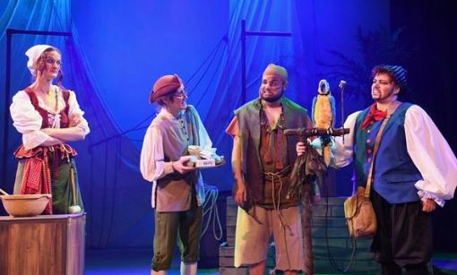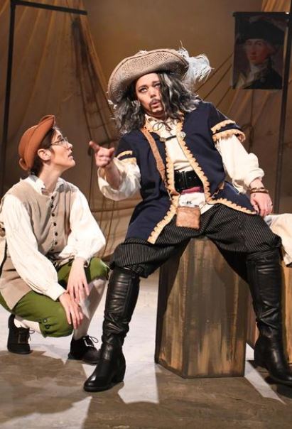 The stage set is flexible, first as the deck of an old sailing ship with sails, ropes and captain’s quarter deck, and then as the island with movable trees. The opening scene with the sound of screeching seagulls and waves crashing against the seashore is very atmospheric and helps to establish an element of realism. A lot of movement of stage props is required and this was handled by the costumed actors seamlessly. The costumes of the pirates are colourful and well-co-ordinated, so too are the costumes of all the characters. The entrances and exits were not always slick, but this did not slow down pace.