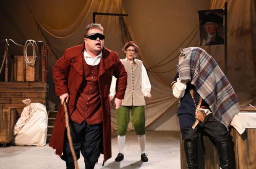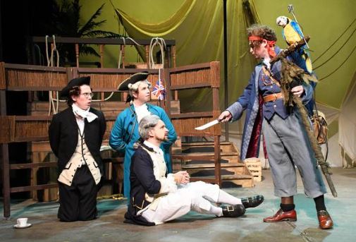 This version of Treasure Island, adapted for the stage by Jago Hazzard, is a parody of the novel with the same title written by R L Stevenson and as such includes a great deal of irreverent material, comedy, corny jokes (though sometimes not), song and some very rhythmic tap dancing performed by Hugo Allain, who plays Squire Trelawney. This is a parody with a difference for it acts as a vehicle to display a range of very good acting skills of actors, who are also required to show their knowledge of different acting styles, e.g. Restoration comedy, Shakespeare, melodrama and slapstick ‘to boot’.