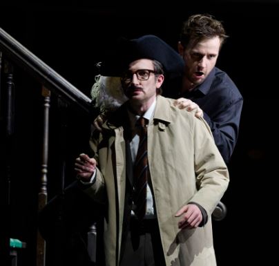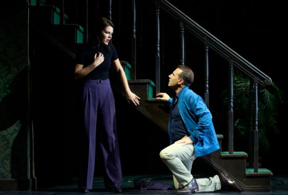 The leavening of the opera with humour falls largely to Leporello. Sam Carl takes on the role with vigour in its knock-about physically. There are some very agile moments trying to escape down and across a set of banisters. With his horn-rimmed glasses and droopy moustache, though, he paints a hangdog picture, and his soft-edged bass-baritone puts a downbeat feel to the role. Leporello gets a big moment towards the beginning of the opera with his famous “madamina” aria, a catalogue (literally, from a notebook) of Giovanni’s conquests, which total 2,065, including the much emphasised mille e tre, the 1003 women in Spain. However, rather than the usual jaunty patter-song style, Carl imbues the aria with a mournful, regretful feel, which perhaps is more appropriate as this is delivered to Elvira, to whom he is trying to put across the idea that the man is not worth her doting over. However, the madamina does trigger a nice visual gag, the hotel’s framed pictures suddenly and simultaneously flipping from the bland landscapes to naked women’s breasts in all sizes, shapes and colours. The point though is made: these pictures are all cropped at the neck; here are faceless women. Leporello wears an office lounge suit and has an archetypical d-o-m raincoat, but he never wears it, only carries it, in much the way that he is obliged to carry his master’s lechery.