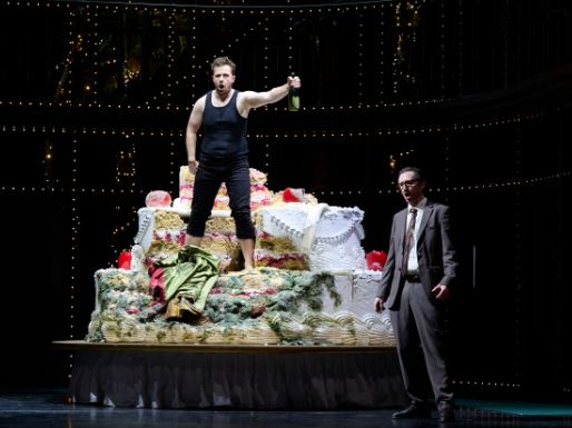 Marriage is an anathema to Don Giovanni, hence his treatment of the two fiancées, Zerlina and Donna Anna, betrothed to his good friend Don Ottavio. That it is a sacrament he is more than willing to desecrate, is lavishly illustrated in Hansan’s design. A stage-filling wedding cake is wheeled in for the feast, ostensibly for the forthcoming marriage of the partygoers. Giovanni uses it as the podium for his “Champagne Aria”, fin ch’han dal vino, before preparing to add a dozen more women to his catalogue. We later see the cake, a squigged mess, with a debauched and drunken Giovanni sitting in it, bottle in hand.