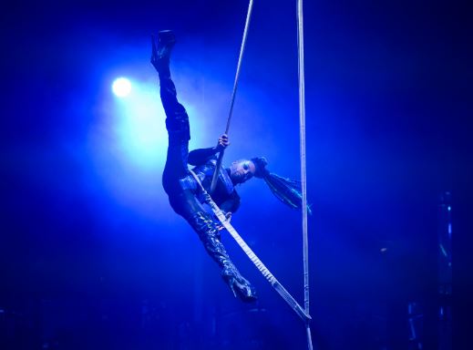 There’s an ever changing cast with an array of talents. Strap hanging demonstrated by Lj Marles, striking with beard, dreadlocks, midnight blue Lycra and incongruously high heels, has nothing to do with commuting on the Northern Line. Aerial tension straps have him spinning with giddying rotations and plunging with jaw-dropping speed. Don’t try this at home.