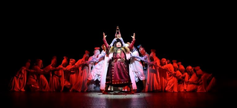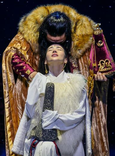 All of the above have made director, Hero Baatar, more determined than ever to bring his production to the stage and it was certainly enthusiastically received by a highly charged and, one sensed, sympathetic audience on one of its first outings on the stage of the London Coliseum. Quite simply, the production is spectacular, in every sense of the word. Its seventy-strong cast, exquisitely adorned in traditional costume, excelled in each and every area of theatrical performance. Traditional dances were immaculately choreographed and delivered a wonderful sense of Mongol spirit, identity and legacy and the acting was superlative.
