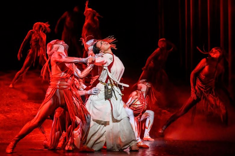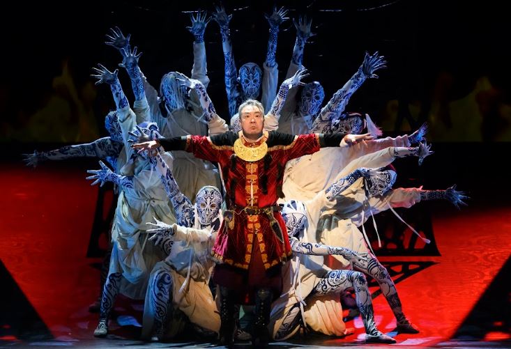 However, this production takes choreography to an entirely different level and one never-before-witnessed by this reviewer. With each spoken line, one witnesses the physical shift in each character’s emotions through the response of the individual’s spirits, represented on stage by a number of perfectly synchronised dancers. Each character has eight spirit bodies mirroring their movements at all times, sometimes immediately replicating, sometimes echoing and, at the other times, even projecting forwards. Picture a camera effect that shows the individual moving forwards but retains their previous position visible by leaving previous frames in view. This almost ethereal trail is the tremendous effect witnessed by the audience. On one occasion, the Khan swings his sword towards Egereg from across the stage and, almost like a scene from Mortal Kombat, his spirit-bodies then project forward, one ‘frame’ at a time, each slightly more progressive with their sword swing and fighting stance and each in perfect synchronisation, until the foremost body engages in combat with the spirit body of Egereg. The effect is jaw-dropping and the level of complexity involved in making this happen, scene after scene, is simply mind-bending.