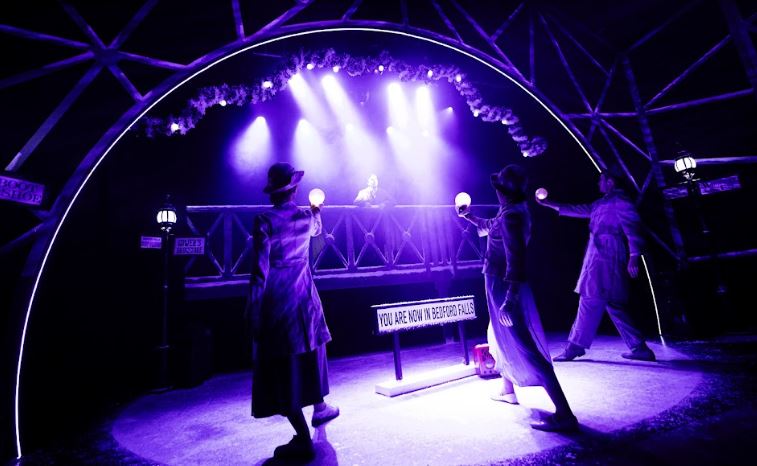 The set design (Libby Todd) captures the cosiness of small-town America as well as a distinct nod to Christmas and its relative traditions. The arched framing of the stage, which mirrors the snow globe-like ornaments, the Guardian Angels, is used to see into our protagonist’s memories. This magical symbolism reminds us of the nostalgia the audience might associate with the story, as well as providing a lens for the audience to peer into the life of George Bailey, a down on his luck banker who has forgone his personal dreams so that he can help others.