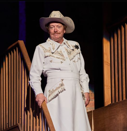 Cast lists these days carry the obligatory they/them parentheses. Suffice it to say, the bandit dude Jack in scarlet and white leather is played by Vinnie Heaven, all smouldering dark eyes and attitude. His love-lust interest, who could pass as a latter day Bonnie and Clyde star Faye Dunaway (Sophie Melville, who plays saloon landlady Miss Lillian) works them both into a lather of longing in a memorable bath scene, even more sexy for keeping their clothes on. Well, most of them.