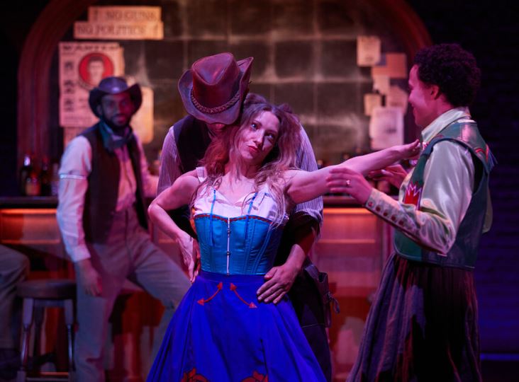 Audiences at the Royal Court are treated to a rare rootin’ tootin’ night of lively music, livelier dance, the steamiest of erotic sex scenes, and furious gun fights overlaid with serious messages of gender inclusivity.