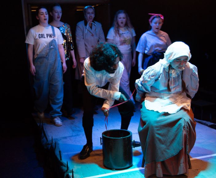 In marked contrast to the unremitting scenes of female subjugation, was the welcome introduction of a number of songs, but with contemporary lyrics. The actors changed into modern dress to perform the songs, allowing them to take a modern sideways glance at the narrative. The quick changes from billowing skirts to modern t-shirts, emblazoned with modern slogans like GRL PWR, were masterly executed. Perhaps the most enjoyable song was If Everybody Worked as Hard as Me performed by Robyn Marriot. More poignantly, the song If you Float, described the ultimate witch test – “if you float you’re a witch, if you sink then you’re dead anyway.” The most touching song was the haunting Lament for Witches, which followed Alice’s final vengeful speech extolling “I’d make wax men and melt them on a slow fire”. The lyric of this final song, turns the bigotry of yesteryear into a question for today, with a thought provoking “look in the mirror tonight, would they have hanged you then?”