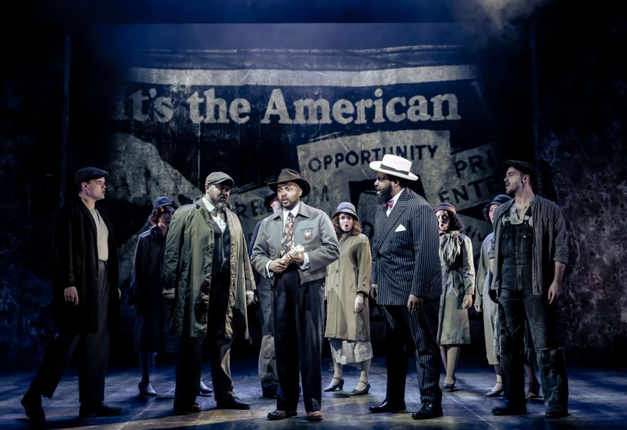 Philip Witcomb’s sepia design hints strongly at the period, commenting on the Great Depression in the USA, which forms the background to the story. The punctured set is perforated with bullet holes and with heavy grids, portcullis-like prison bars, all constantly on the move as the scenes travel with the fugitives. It is further enhanced by the lighting and video designs of Zoe Spurr and Nina Dunn, which are exceptional. All gives a film noir or film gris effect, but is dynamic and agitated.