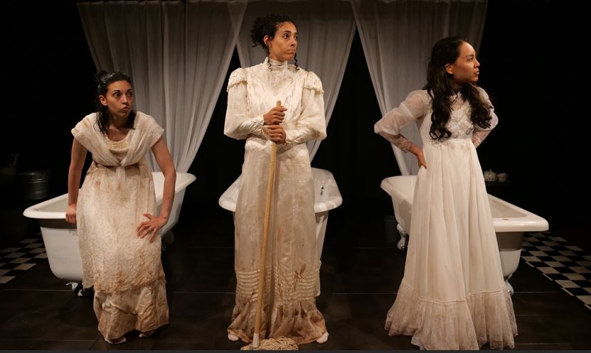 Director Alexsandra Marzocca keeps the story moving at a brisk pace, with transitions marked mainly by dramatic lighting changes. Props are concealed artfully around the plain set, often in the three bathtubs, so nothing interrupts the flow, except occasionally the audience’s laughter.