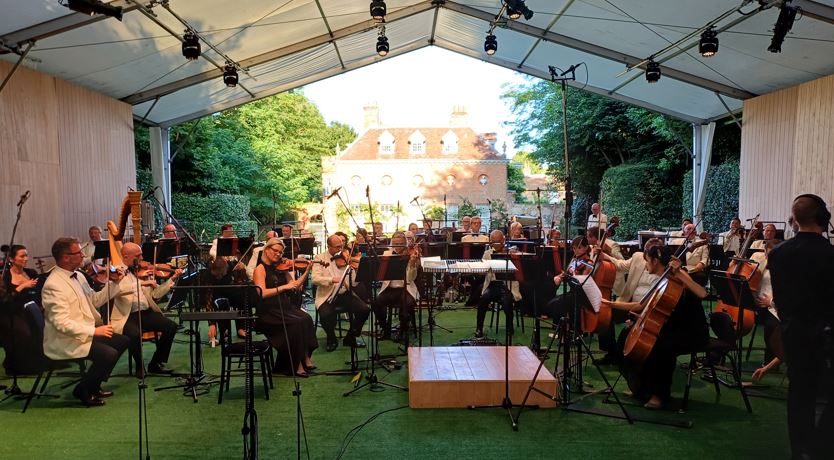Gleaming white decorated canvas of the dining pavilions by the glittering lake and Marylyn Abbott’s gardens, swollen with blooms in all their glory, form the setting for the opening event of West Green House Opera’s new season. It is the hottest day of the year (“so far”, add the meteorologists) and there is quite a party atmosphere as the champagne corks pop. And pop they do, as ice-pack sleeves don’t stay frozen long at 32°C. Bacchus smiles out, appropriately, from the programme cover.