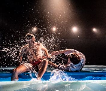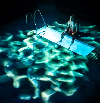 The set is in keeping with the production’s values; simple, direct, effective. At the beginning of the play, the removal of a red cover reveals a body of water which serves as Ray’s pool, the only place where he feels safe and confident.
