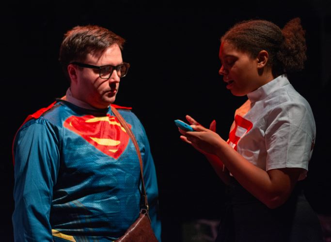 Piers, played by Alfie Lanham-Brown, struts briefly around, an archetypical whiz kid, but then he discovers a former classmate, Tomas sitting there amongst us. (The audience does get rather drawn into this piece.) Tension soon replaces confidence.