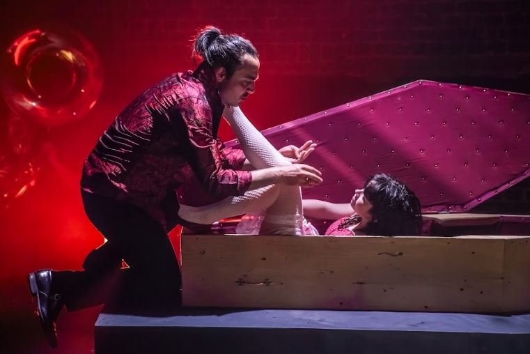 But these are small niggles and don’t prevent a talented cast from creating an impact. Giuseppe Pellingra with his long hair, unbuttoned shirt and cool shades perhaps has more rock star charisma than vocal heft in the title role. Jack Roberts wields a fine tenor in the slightly thankless role of Aubrey, his rival for Malvina, played by Milena Knauß, who makes the most of her coloratura opportunities as the heroine. Connall O’Neil displays a good voice as the oppressive father keen to marry his daughter off to the Vampire – no questions asked as he had an aristocratic title – and Madeleine Todd and Amber Reeves do a nice job with the Vampire’s other victims.