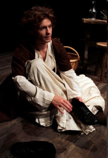 Playing against a bare black stage decorated by little more than a costume rack and a wooden table, Uff commands the audience’s attention throughout an emotional account of his own life story, drawing out the parallels between the Boy Actor, his mother, and Nell Quickly. What begins as light comedy about “Master Shakespeare” giving him acting tips, and more advice from the great Richard Burbage, becomes a charged and often harrowing account of life in Elizabethan London. From his surrogate father who finds himself press-ganged into the Royal Navy for three years, to the matter of fact story of his mother prostituting herself in their tavern while the boy was forced to serve ale in the bar and listen to the drinkers compare their experiences, Uff pulls no punches in his delivery. That the whole piece is performed as he very slowly dons Nell’s costume, and talks about her character’s fate, adds an extra layer of pathos.