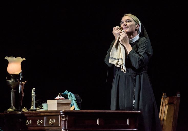 The staging and costumes were visually striking. The desk onstage symbolizes power; the Abbess removes a mirror and brush from a newcomer’s suitcase and locks them in the desk, reinforcing the suppression of individuality. The conversation between the aunt and Angelica across the desk becomes a battle between evil and purity, self-righteousness and true righteousness. The Madonna is a limp idol, prayed to by the nuns, but offering little comfort.