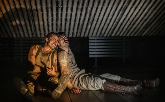 The second act switches settings drastically, however, to the trenches of 1916. With some clever changes to Jason Taylor’s lighting, Richard Kent’s set of wooden slats transforms from the high walls of a country house to the more claustrophobic setting of trenches, dug-out shelters, and long narrow tunnels.