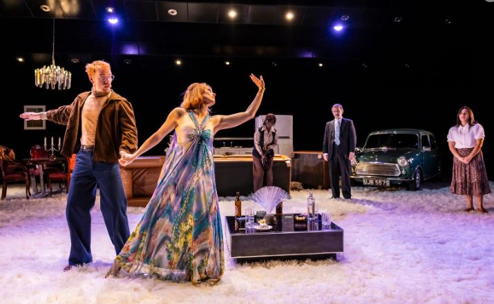 Another fresh vision is the creative set designed by Anna Yates. Gone was the usual closed box set to be replaced by an inventive open stage. This was a set without walls – kitchen, dining room, living room, utility room, garage and even the loo were on open show. At the back of the set was another star of the show, the Cooper’s car – an actual green mini of the period – UJB 557S (but, for purists, without a tax disc on the windscreen!). Beverley’s fully-fitted kitchen was also on show, full of new-fangled labour-saving gadgets that Beverley was famously incapable of using. Then, in the foreground, the main living area with all the trappings of the Cooper’s shallow and pretentious lifestyle – white shag carpet throughout like a layer of snow, the drinks cabinet, the record player, the three-piece suite complete with zebra print throw and, of course, bottles of Bacardi, LP’s and a tray of cheese and pineapple on sticks. Also complementing the production was Jaimie Lu’s sound design with dramatic music ranging from repetitive techno beats to Beethoven’s Fifth.