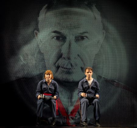 Over half of the cast never appear on the stage, but are seen and heard, larger than life as pre-recorded footage on that all-seeing eye screen. These include two of the characters who drive the plot. Emmanuel Goldstein, once one of the Party’s top men, now the counter-revolutionary figurehead, or maybe ostensibly so, for in this world of mirrors where nothing is as it seems, this archnemesis could be a set-up to act as the focus for the people’s whipped-up venom, as seen in regular collective rants against his image, the “Two Minute Hate”. Finbar Lynch plays Goldstein as a gaunt and flinty figure, adamant in his dissidence. And of course there is Big Brother, the all-powerful leader, around whom a personality cult is built by propaganda, coercion and fear; think Fidel Castro or Mao Tse Tung. We only see Big Brother towards the end, when Nicholas Woodeson portrays him as an apparently genial figure, but whose short speech has the sting in the tail, veiled threats to toe the line. The moustachioed Woodeson’s Big Brother is clearly based on Stalin, the arguably the most prolific killer the world has ever known.