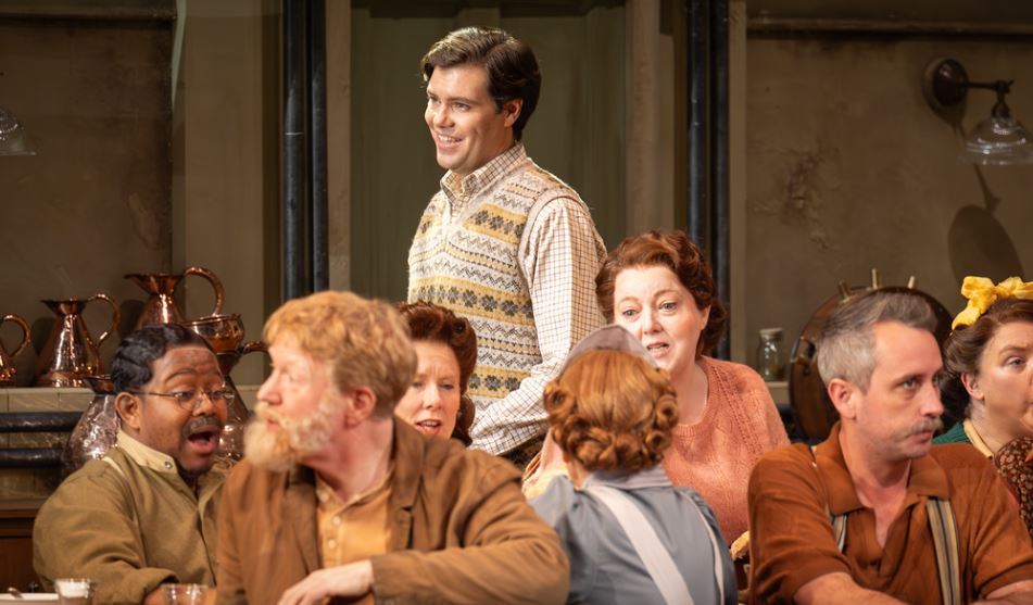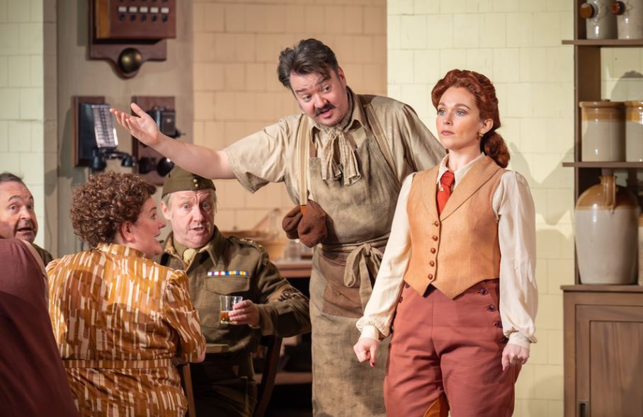 The curtain goes up on a huge country house kitchen, which gradually fills up with Land Girls and farm workers who are being given their lunch. Nemorino is reading a book, and Adina appears in riding dress. This is a pleasing and effective setting for Act One – all credit to Set Designer, Nicky Shaw, and Costume Designer Zahra Mansouri. For Act Two, we are in a reception room where the covers from the furniture are hastily removed and the sash windows – through which everyone comes and goes as if they were French windows – are opened and a hastily baked wedding cake is placed on the table, and everyone appears in their Sunday best (except the Land Girls and airmen who remain in uniform).