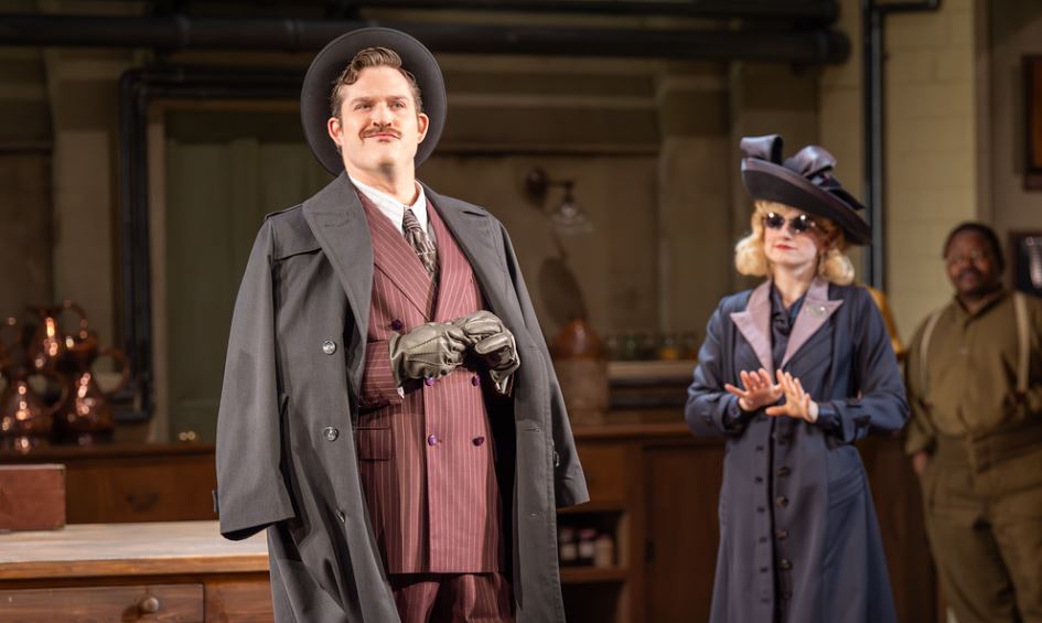 As we enter the Coliseum, instead of a curtain we see a ginormous television screen on which the rotating lights at the top of the Coliseum have replaced the spinning globe of the BBC logo from the 1970s. When the prelude starts, we get hilarious pre-programme credits (designed by Matt Powell). This is all very charming and amusing and is done with an expertly light touch and doesn’t outstay its welcome, insist on its own clever-cleverness, or distract the audience’s attention.