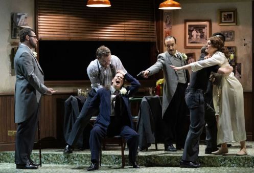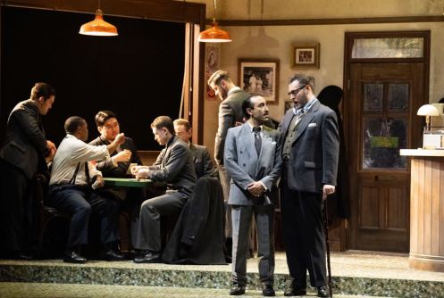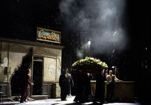 The action of the opera is set solely within the base of the wider Capulet clan, under the leadership of the hardened Capellio. In designer Lily Arnold’s late 1960’s setting this is initially in the café-diner that forms the front for the Capuleti’s cocaine smuggling racket. This is stated to be in New York City, but in truth could be in any world city with Italian diaspora, or indeed in Italy itself. The sepia set gives a well-used and slightly faded look, and the period and setting is detailed in the counter, bar stools and coffee machine, and in the spindly furniture of the seating area.