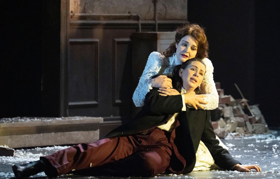 The all-male ensemble, four in the Capuleti mob, three in the Montecchi, have quite a presence as they colour-in the action. (Bellini and his librettist, and good friend, Romani had related them directly to the historical rival political factions Guelph and Ghibelline in mediaeval Italy.) In the second scene, tensions mount even higher culminating in physical violence when Romeo and the Montecchi storm the Capuleti diner just as the celebrations prior to the wedding of Giulietta and Tebaldo get underway. Fight director Kaitlin Howard and movement choreographer Carmine de Amicis have worked in great detail together in creating a wide brawl, with guns, knives and fists (plus walking-stick) to great effect. It is executed in slow-motion which is timed perfectly with Bellini’s music. What could be a cinematic slo-mo cliché, is quite a tour de force. And surely never before has an opera’s first half culminated in the throwing of a live Molotov cocktail.