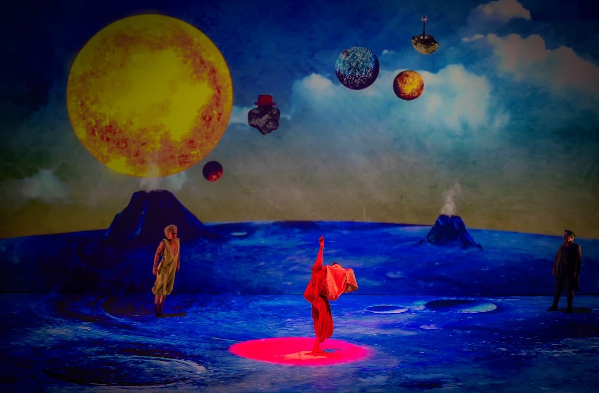 We are transported across the Prince’s visits to eight planets through video designer, Marie Jumelin’s exquisitely beautiful projections onto the vast stage. These landscapes are a feast for the imagination to run wild and provide the immersive backdrop where the Prince meets a number of different characters. Particularly creative are Killian Mermet’s The Fox and Marta Kowalewska’s The Snake, whose costumes, make up and movements convert them from human to animal. Throughout these encounters, themes such as loneliness, friendship, love and loss are touched upon.