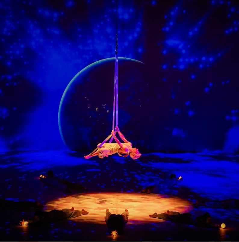 The fantastical projections leave little use for props or scenery, save the hanging straps that the performers use to fly, in what is an impressive display of strength, grace and agility. Especially breathtaking is Marcin Janiak’s Lamplighter, suspended on his swinging lamp and Barone’s use of the straps to hold not only his own body weight but that of his love, The Rose (Marie Menuge). She hangs from him in a manner symbolic of their rather one-sided relationship. Her costume, (designed by Peggy Housset) is so evocative, we forget this is a human and become lost in the soft floating petals of the flower’s form.